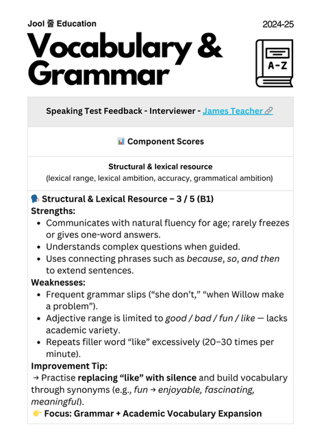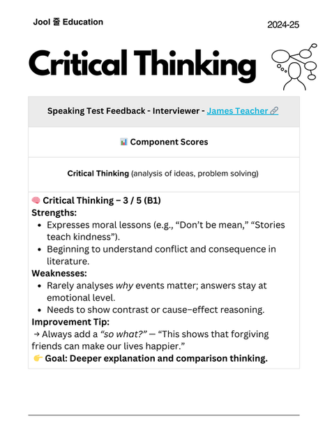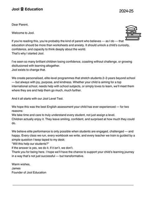 대부분의 레벨테스트는 '점수'만 알려줍니다. 하지만 점수로는 아이의 잠재력을 알 수 없습니다. Jool의 진단은 다릅니다. 저희는 아이가 어떻게 생각하고, 논리를 펼치며, 자신을 표현하는지를 영국 정통 교육 방식(British Heritage)으로 분석합니다. 무엇을 분석하나요? (The 3-Part System) 1:1 Founder Interview (20분): 설립자 제임스 선생님이 직접 아이의 유창성, 비판적 사고력, 학업적 호기심을 대화를 통해 진단합니다. Oxford Online Test (60분): 전 세계 국제학교 입학 기준이 되는 CEFR 레벨을 정확히 측정합니다. Writing Assessment: 문법의 정확성뿐만 아니라 논리적 구조와 어휘의 깊이를 평가합니다. 받으시는 결과물: ✅ 10페이지 프리미엄 리포트: 각 영역별(어휘, 유창성, 논리력) 상세 점수와 구체적인 학습 로드맵이 담긴 PDF 포트폴리오. ✅ 개인 맞춤형 비디오: 제임스 선생님이 학부모님께 직접 전하는 분석 영상 메시지. ✅ [BONUS] 맞춤형 워크북 (PDF): 진단 결과에 따라 아이의 레벨에 딱 맞는 Jool 정품 워크북(25,000원 상당)을 선물로 드립니다. 지금, 아이의 진짜 잠재력을 확인하세요.